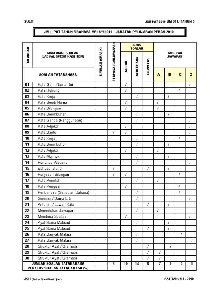 Contoh Jadual Spesifikasi Ujian Bahasa Melayu Tahun 5