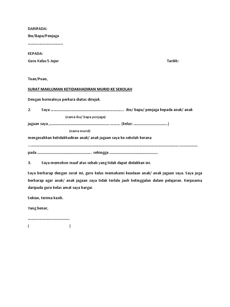 Contoh Surat Pemberitahuan Ketidakhadiran Kepada Ibu Bapa