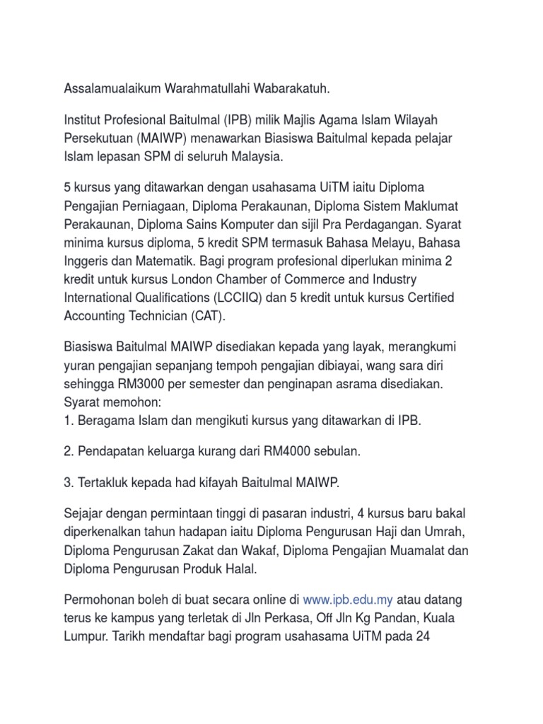 1 863 likes 9 talking about this. Diploma teknologi maklumat keusahawanan program uitm. Keistimewaan kursus diploma pengurusan haji umrah dphu untuk lepasan spm atau individu2 yang berminat untuk mengikuti pengajian secara sepenuh masa pengiktirafan mqa latihan industri akan dijalankan di tanah suci mekah madinah. Diploma pengurusan haji dan umrah dphu telah mula diperkenalkan di kolej profesional baitulmal kuala lumpur kpbkl kepada pelajar lepasan spm bermula pada april 2015.