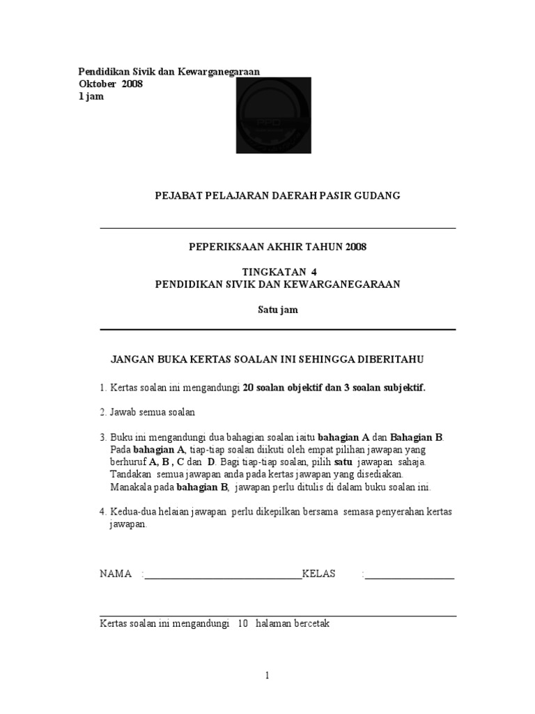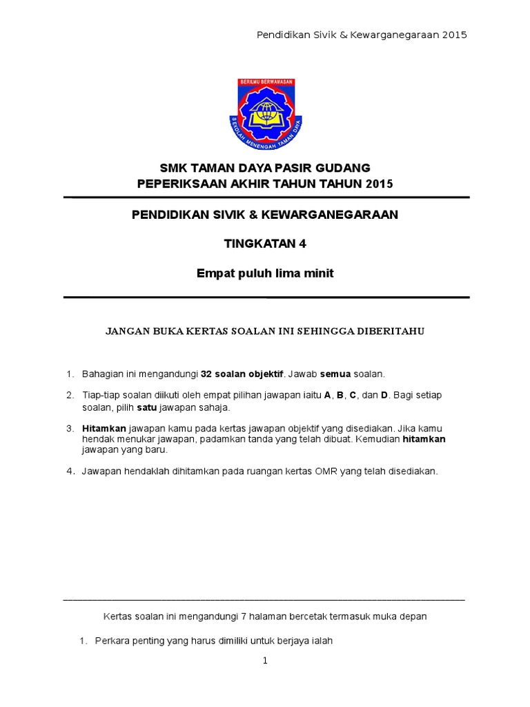 Peperiksaan akhir tahun pendidikan sivik tingkatan 4. Contoh soalantelah dikumpulkan mengikut subjek. Bank soalan ujian akhir tahun tingkatan 4 kurikulum standard sekolah menengah kssm merupakan kurikulum baharu yang diperkenalkan pada waktu ketika kssr diperkenalkan di sekolah rendah. Soalan peperiksaan akhir tahun tingkatan 4 sejarah jawapan k sila share kepada kawan kawan dengan menekan butang di bawah sejarah jawapan. Panitia pendidikan sivik dan kewarganegaraan smkdzm rabu 22 februari 2017.