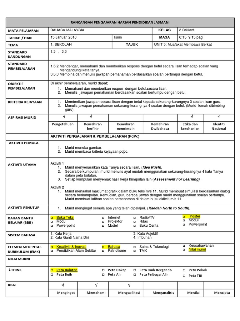 Templat Rancangan Pengajaran Harian Rph Pembelajaran Abad Ke 21 Pak 21
