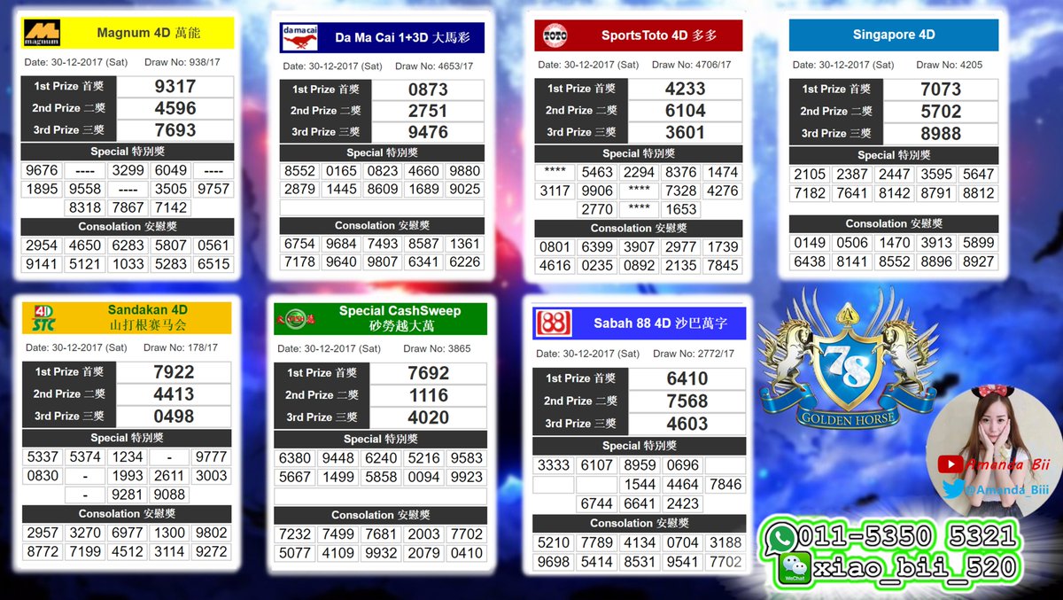 Amanda Bii On Twitter Https T Co Elhbo8byhg Golden Horse 4d Special Draw Result 30 12 2017 Sat Goldenhorse78 Joker123 Baccarat Livecasino Bestonlinecasino Scr888 Livegame S8star Rollex Live22 Lpe88 Slotgamemalaysia Roulette